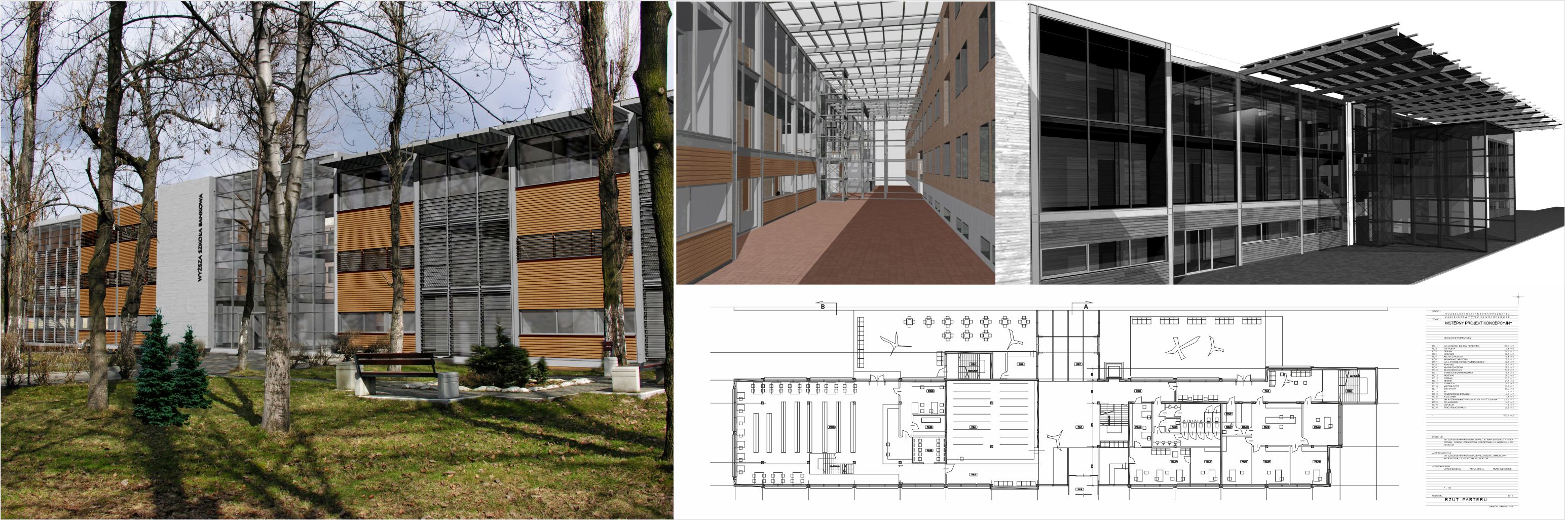 Wydział zamiejscowy w Chorzowie. Powierzchnia użytkowa - 3078,6m2. Powierzchnia zabudowy - 1273.3 m2. Kubatura obiektu - 14 200m3