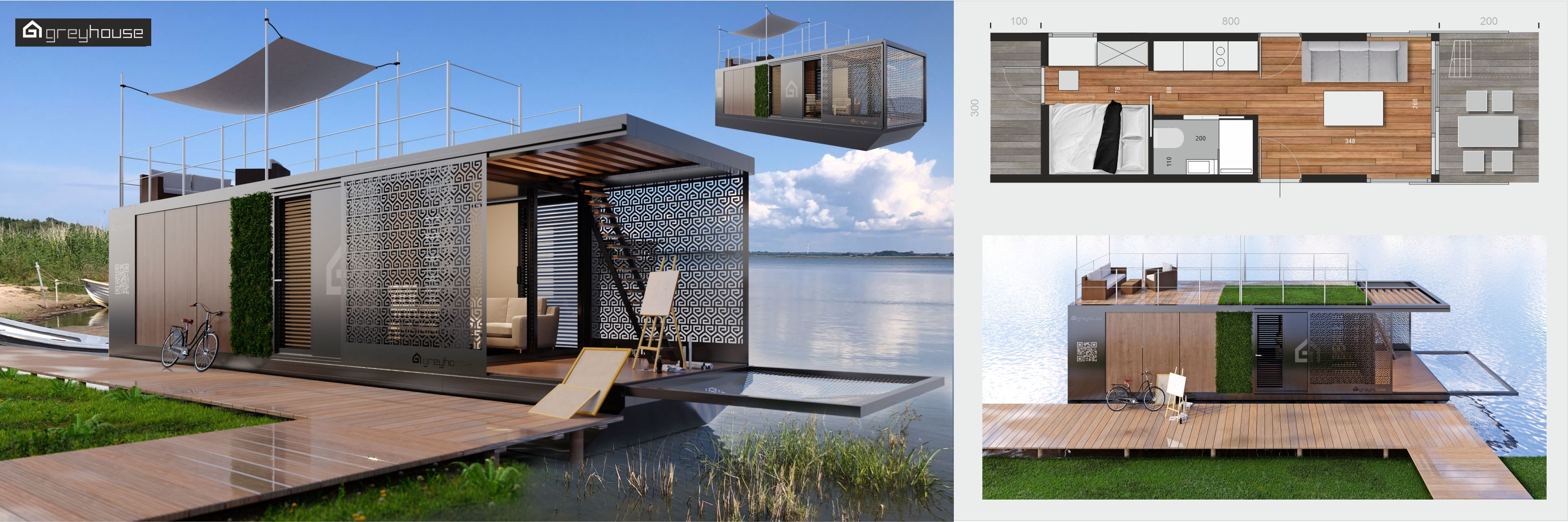 Domy na wodzie to doskonała alternatywa dla domów tradycyjnych skierowana do osób, które chcą zamieszkać blisko natury. Stabilne pływaki wykonane z betonu stanowiącym fundament domu. Modułowa rama wykonana ze stali ocynkowanej sprawia że całość konstrukcji jest odporna na działanie czynników atmosferycznych. Platforma 33 m2, apartament 20,6 m2, tarasy dolne 9 m2 ,taras górny 24 m2