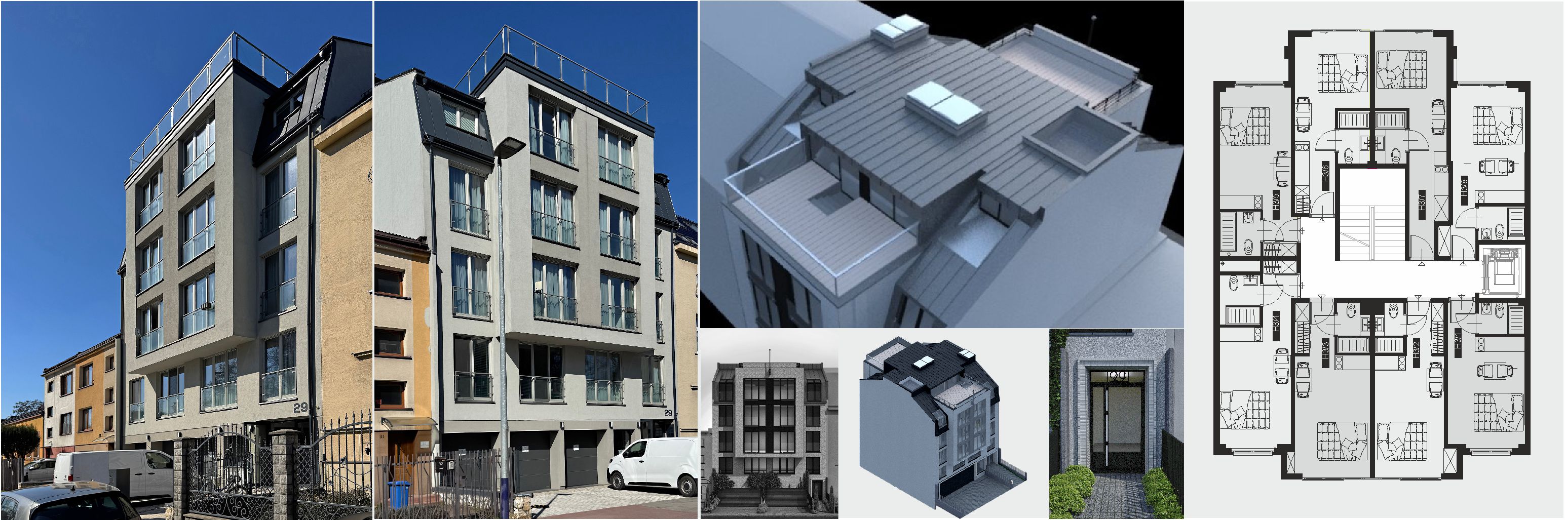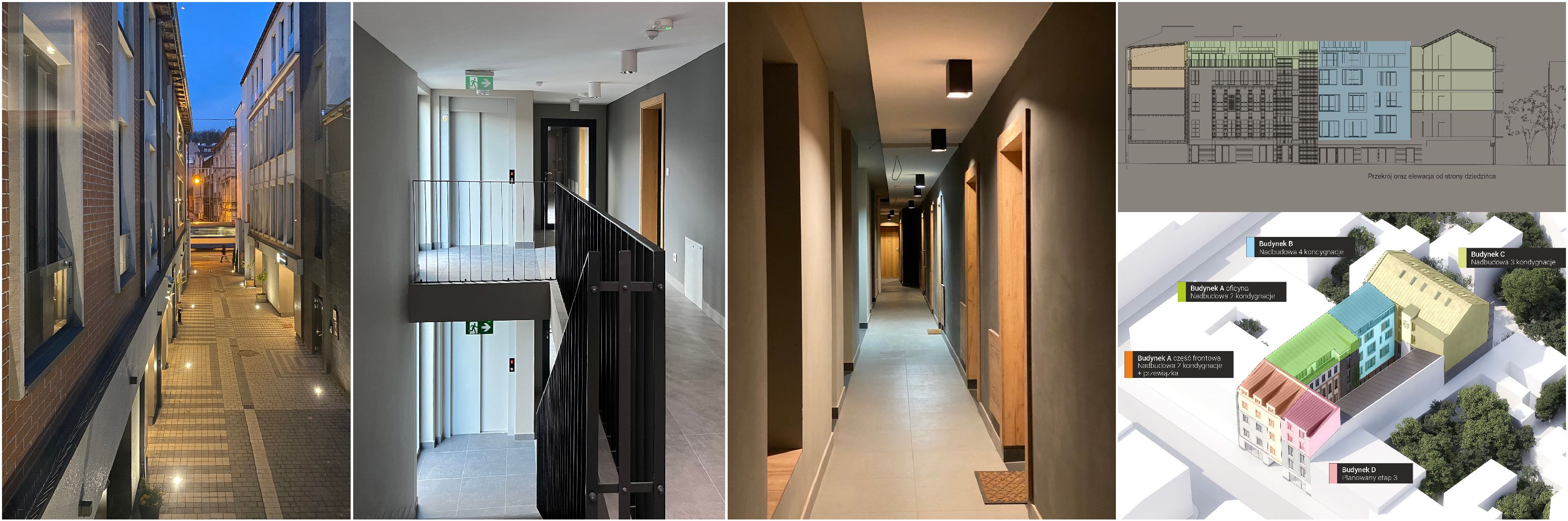 4 etapy inwestycji, 1500 m2 PUM, 24 apartamenty, 4 windy osobowe, tarasy na dachu. Inwestor: Architektura Inwestycje sp. z o.o.