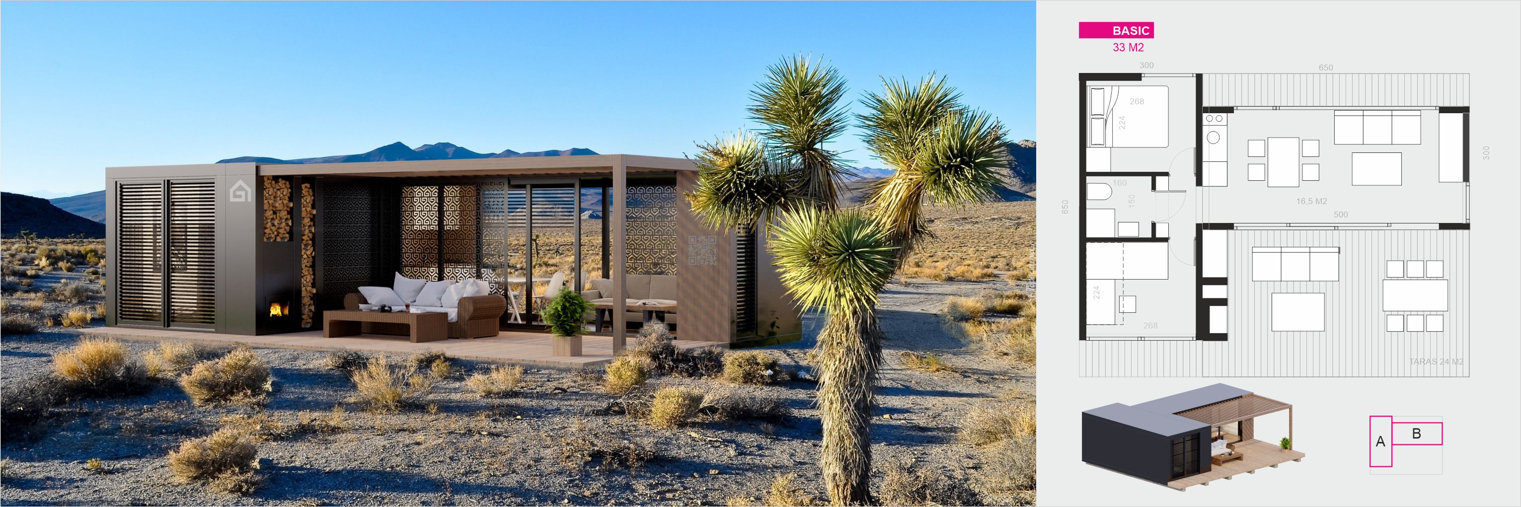 Model Basic stanowią dwa moduły o wymiarach 650cm x 300 cm lub 650 cm x 250 cm. Mogący pomieścić od 4 do 6 osób. Moduł A – jest typowym modułem sypialnianym z łazienką. Moduł B jest modułem stanowiącym salon domu wraz z kuchnią. Powierzchnia użytkowa 33 m2