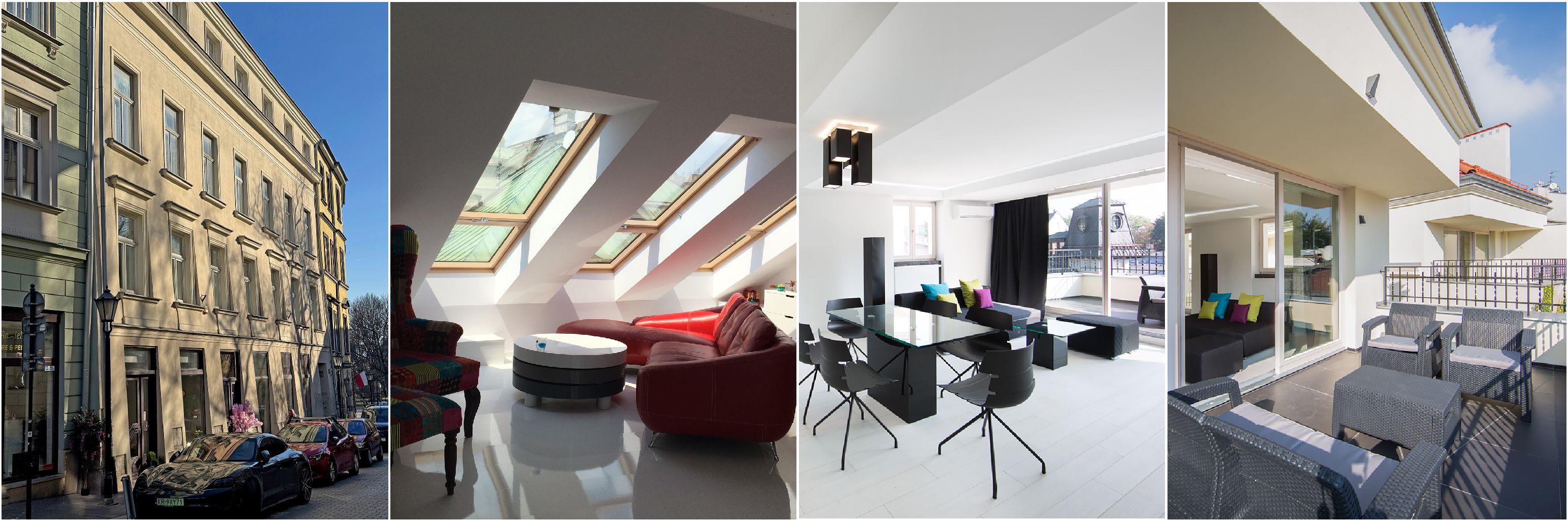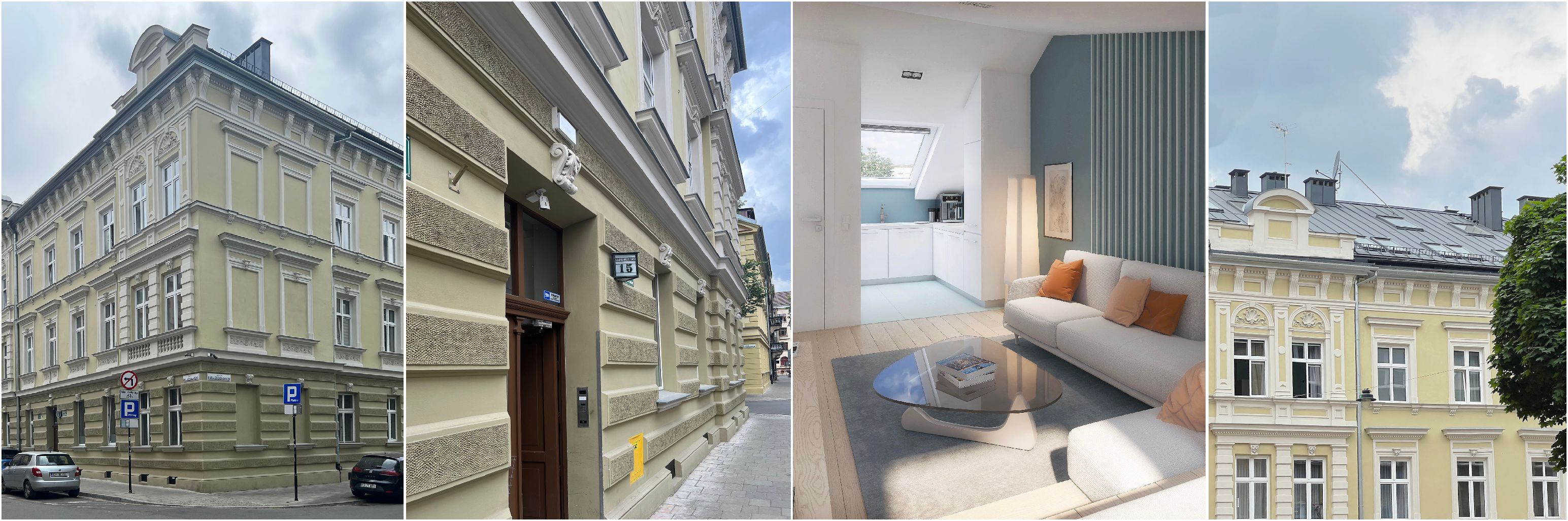 Apartamenty premium. Pięć apartamentów z tarasami z widokiem na Wawel. Garaż podziemny. Powierzchnia całkowita 602 m2, powierzchnia działki 180 m2.